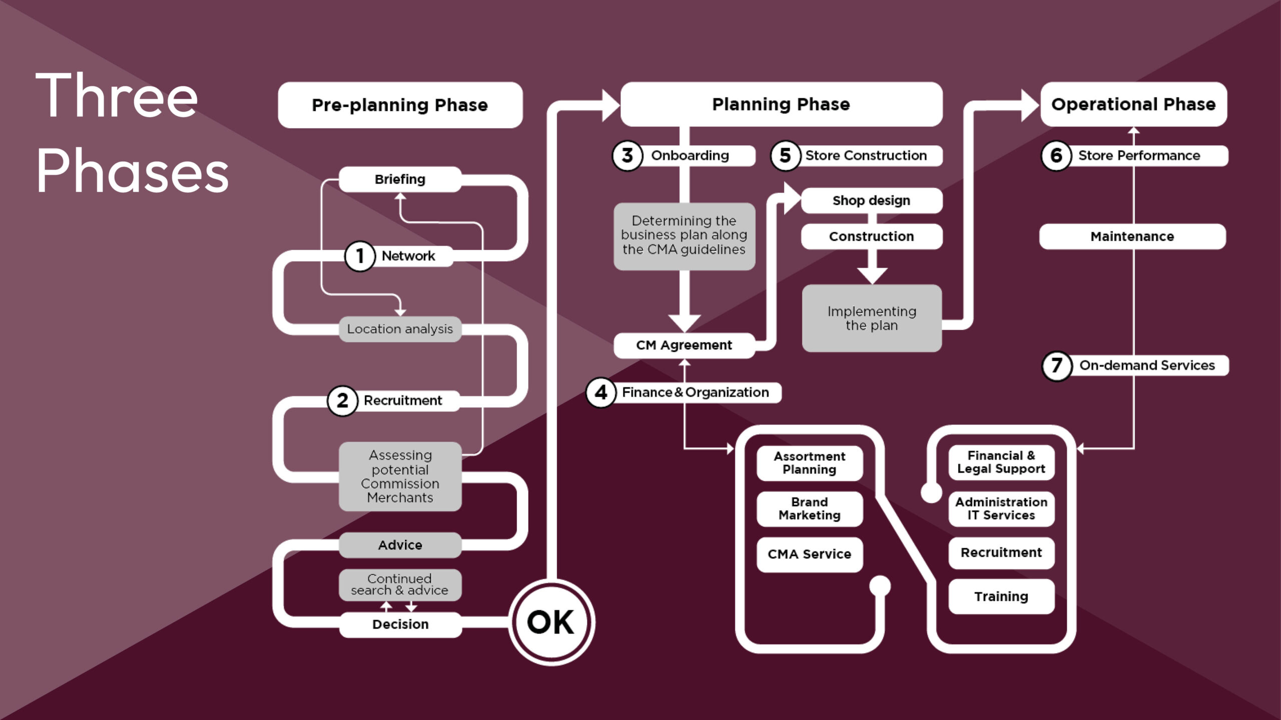 In nauwe samenwerking met uw merk zetten we in 3 fases en met 7 verschillende services het meest duurzame winkelnetwerk op.