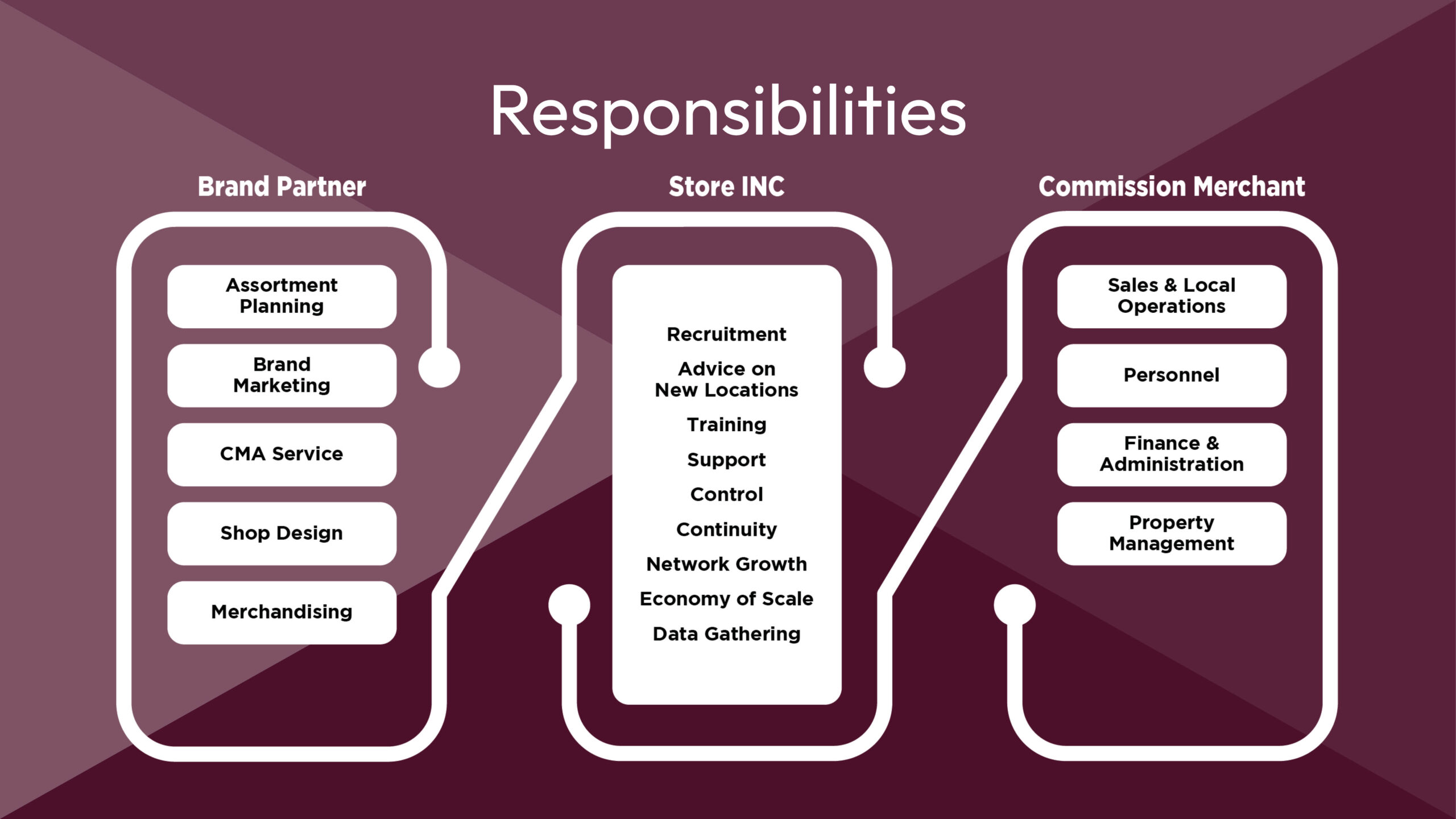 Met de goedkeuring van uw merk zoekt Store INC de juiste locatie, met de juiste Commission Merchant Partner aan het roer. En zorgt Store INC ervoor dat deze Commission Merchant Partner handelt binnen het merk-DNA.